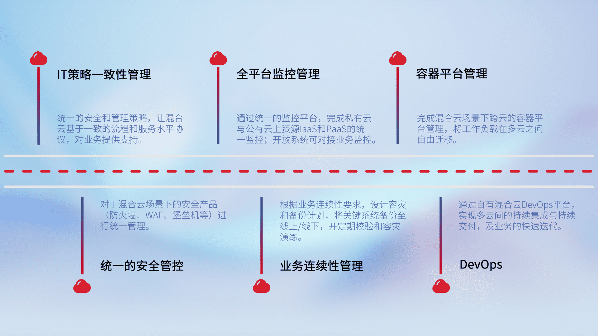 通过多云纳管,,,,以统一的资源数据模型把客户的云资源进行抽象和封装,,进而实现对多云资源的统一操作,,保障云资源管理的可靠性、、稳定性与可用性。。量身定制化运维内容,,,,配置、、、、开发运维、、、补丁管理、、备份、、、监控、、、、认证和访问管理、、、、审计和日常巡检等,,保障在用云过程中的可靠度,,稳定度以及高可用率。。。