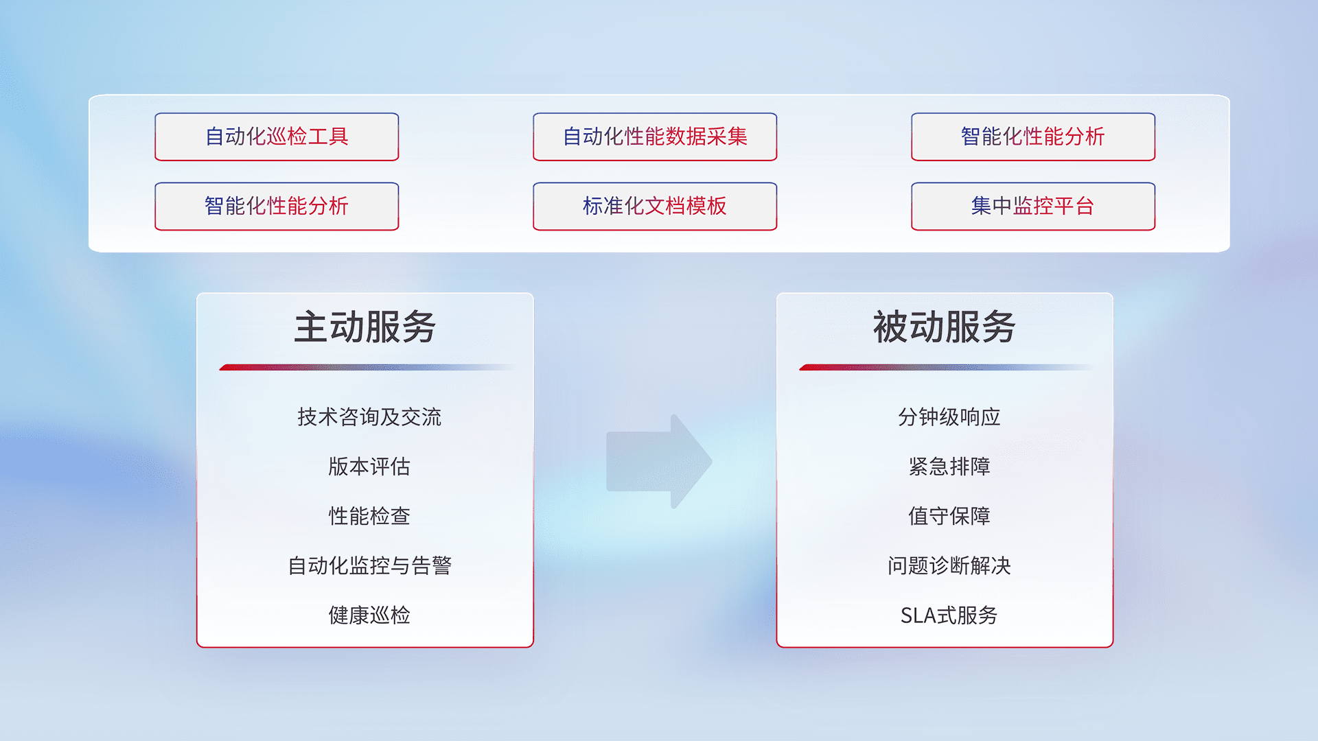智能化工具和标准化文档,,,,保障服务质量,,提供主动服务(包含技术咨询、、版本评估、、性能检查、、、自动化监控与告警、、、健康巡检)和被动服务包含(分钟级响应、、、、紧急排障、、、值守保障、、、、问题诊断解决、、SLA服务)。。