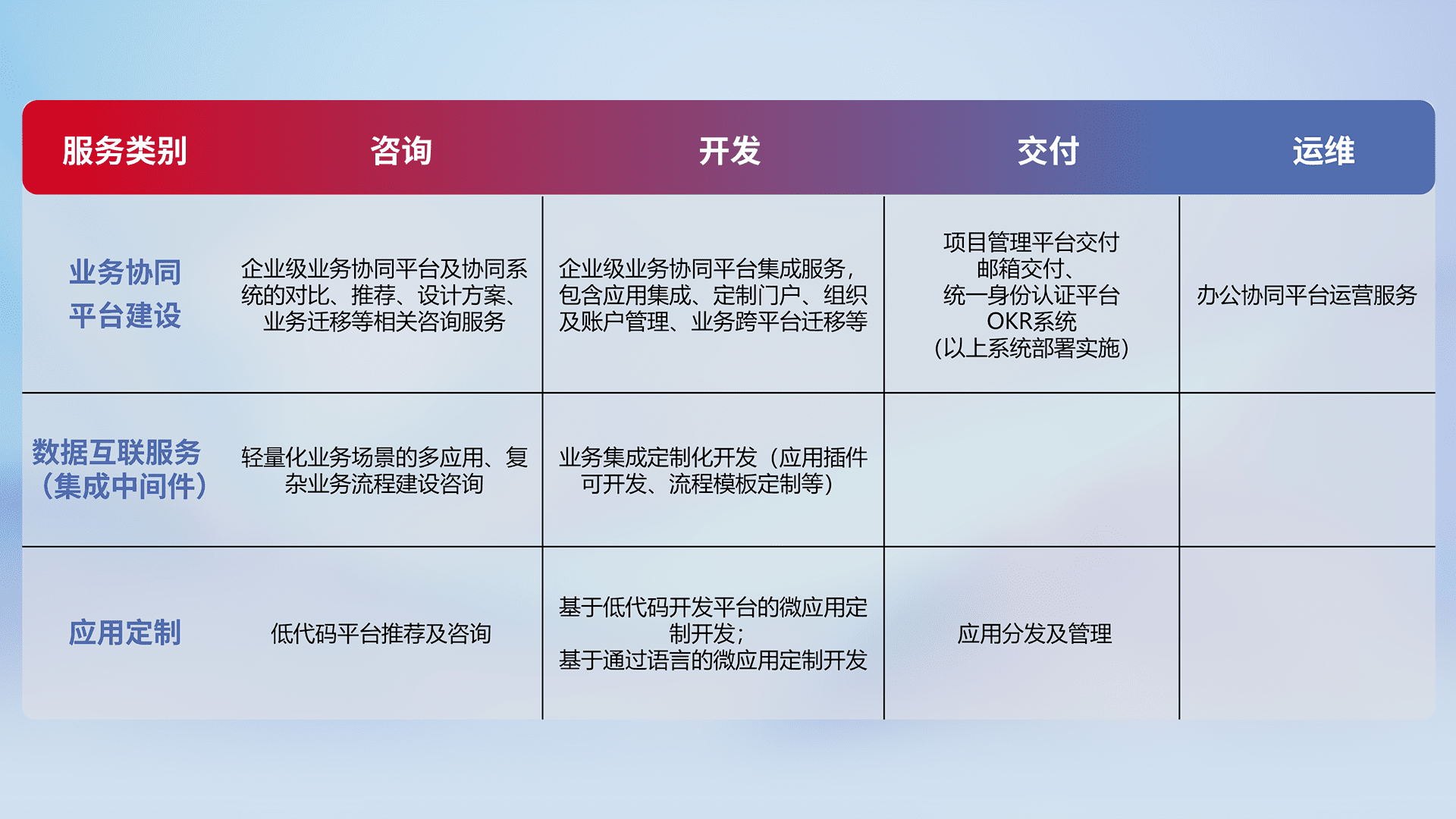 针对钉钉、、、企微、、IDaas等平台级产品提供产品的规划、、、、方案、、交付、、定制化开发等服务,,,实现如统一协同办公、、、智能客户服务、、混合会议管理、、、、智能数据查询、、等业务场景,,,实现数字化转型。。。
